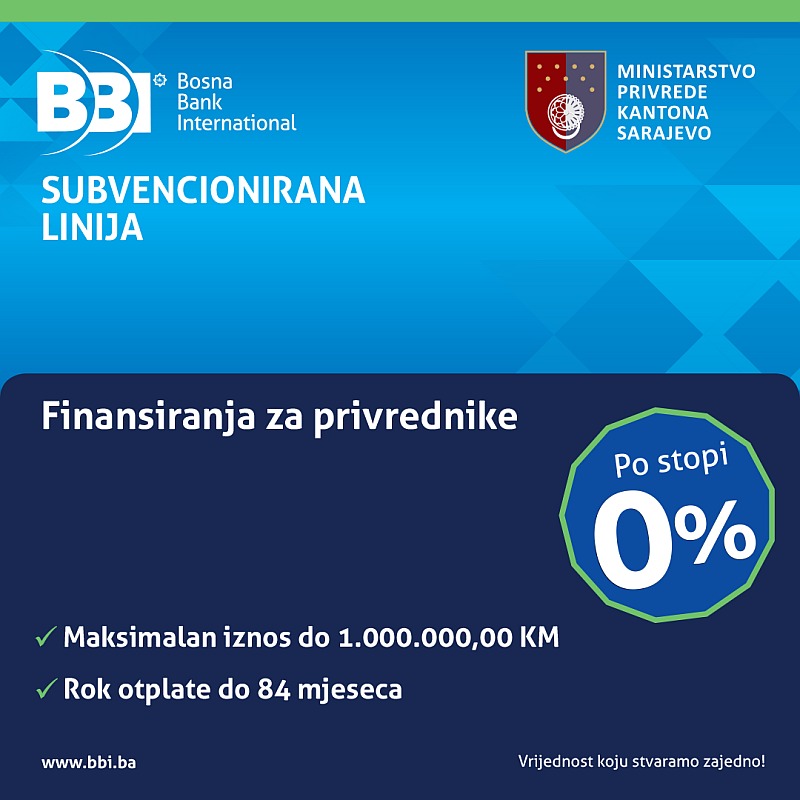 Privrednici iz Kantona Sarajevo još uvijek imaju priliku ugovoriti finansiranja u BBI banci po stopi od nula posto. Projekat koji realizira BBI banka uz subvenciju Ministarstva privrede Kantona Sarajevo, odlična je prilika za privrednike, za sklapanje ugovora za povoljna finansijska sredstva i to do 31.10.2023. godine. BBI banka je u ovu svrhu obezbjedila 49,5 miliona KM iz vlastitih izvora, a Ministarstvo privrede KS pokriva troškove regresiranja profitne marže, pa privrednici mogu dobiti sredstva po stopi od nula posto, nakon subvencije.