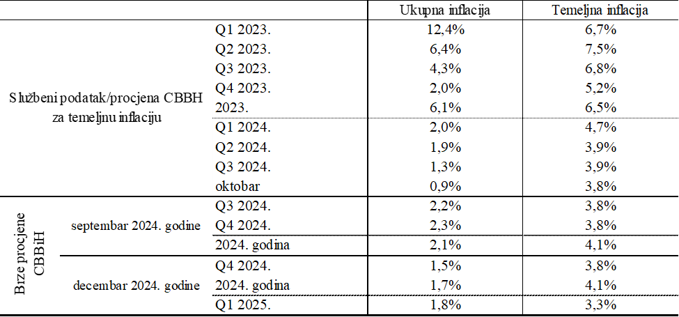 Ukupnu inflaciju u četvrtom kvartalu 2024. godine procjenjujemo na 1,5%, a temeljnu na 3,8%. Očekujemo da će povećanja cijena prevoza, zbog temeljnog efekta, i uticaj prelijevanja poskupljenja električne energije, imati nešto jači uticaj na dinamiku kretanja indeksa potrošačkih cijena u narednom periodu. Naša preliminarna procjena ukupne inflacije u prvom kvartalu 2025. godine iznosi 1,8%, a temeljne inflacije 3,3%. Inflacija u BiH je primarno pod uticajem promjena u nivou temeljne inflacije, iz koje se isključuju cijene hrane, alkoholnih pića i duhana, te energenata, što ukazuje da je očekivani rast domaćih cijena značajno uzrokovan očekivanim rastom cijena usluga. Inflaciju u sektoru uslužnih djelatnosti, za prvih deset mjeseci 2024. godine, procjenjujemo na 4,9%.
