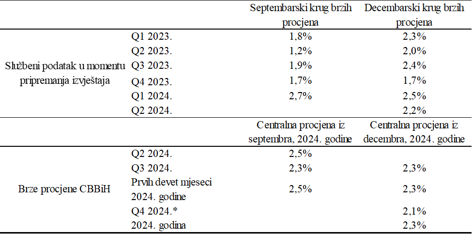 Na osnovu raspoloživih zvaničnih statističkih podataka, i informacija s međunarodnih tržišta objavljenih do 10. decembra 2024. godine, Centralna banka Bosne i Hercegovine (CBBiH) procjenjuje godišnji rast realnog BDP-a u trećem kvartalu 2024. godine na 2,3%, što je identično procjeni iz septembra. Umjeren rast ekonomske aktivnosti rezultat je intenzivne aktivnosti u uslužnom sektoru, koja djelimično kompenzira pad aktivnosti u prerađivačkom sektoru. Od početka godine, najveći doprinos godišnjim stopama rasta davale su djelatnosti trgovine, hotelijerstva i ugostiteljstva, dok je negativan doprinos imala djelatnost prerađivačke industrije.
