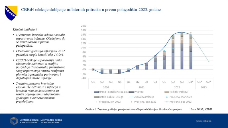 Daljnje usporavanje inflacije očekuje se u prvoj polovini naredne godine, prvenstveno zbog baznog efekta iz 2022. te efekata već izmijenjenih i najavljenih monetarnih politika vodećih centralnih banaka. Uprkos očekivanom usporavanju inflacije u 2023, ona će i dalje biti znatno iznad višegodišnjeg prosjeka za BiH.