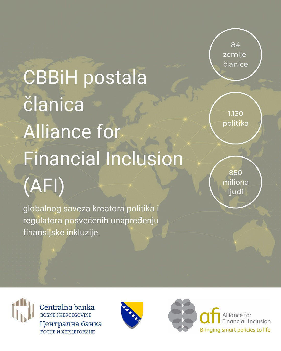 Centralna banka Bosne i Hercegovine (CBBiH) postala je članica Alliance for Financial Inclusion (AFI) – globalnog saveza kreatora politika i regulatora posvećenih unapređenju finansijske inkluzije. AFI okuplja centralne banke, regulatorna tijela i druge relevantne institucije iz 84 zemlje, s ciljem razmjene znanja, iskustava i najboljih praksi u oblasti finansijske inkluzije, finansijske edukacije i razvoja inkluzivnih finansijskih politika i strategija.