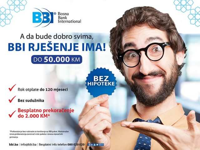 Sa sloganom “A da bude dobro svima, BBI rješenje ima”, Bosna Bank International d.d. pripremila je novu akcijsku ponudu finansiranja. Ova akcijska ponuda finansiranja dostupna je postojećim klijentima BBI banke, ali i onima koji će to tek postati. Uz iznos finansiranja do 50.000 KM, fleksibilno obezbjeđenje i rok otplate do 10 godina, ovu posebnu ponudu odlikuju i dodatne pogodnosti kao što je besplatno korištenje prekoračenja po tekućem računu u iznosu do čak 2.000 KM uz aktivaciju jednog od BBI paketa.