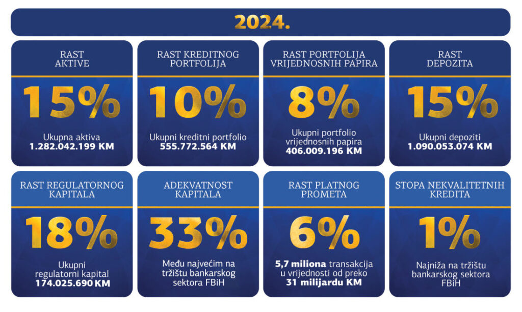 Obilježavanje ovog značajnog jubileja prate izuzetni rezultati poslovanja i u 2024 godini sa rastom aktive, depozita, kapitala, platnih transakcija, broja klijenata, profitabilnosti i drugih pokazatelja uspješnog poslovanja. Ostvaren je značajan rast kreditnog portfolija i najmanja stopa učešća nekvalitetnih kredita u kreditnom portfoliju Banke u poređenju sa bankarskim sektorom u Federaciji BiH, a što je jedan od ključnih pokazatelja stabilnog poslovanja i rezultat adekvatnog upravljanja rizicima.