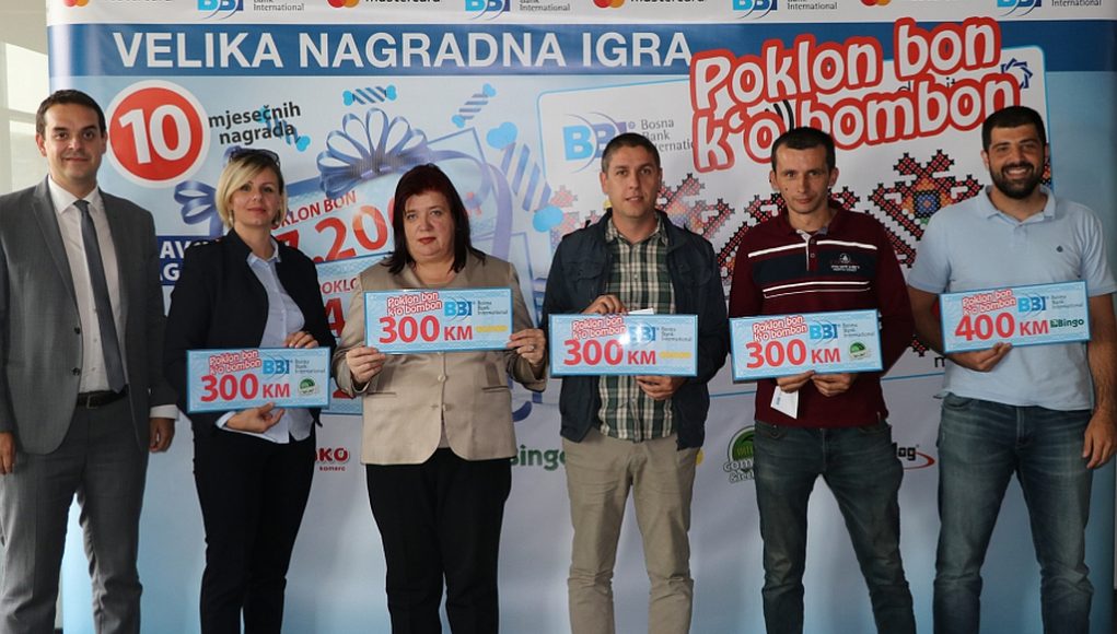 BBI banka u saradnji sa kompanijom Mastercard pokrenula je nagradnu igru “Poklon bon k’o bombon“za sve korisnike BBI Debit Mastercard i Gold Debit Mastercard kartica. Učešće u nagradnoj igri, koja traje od 15.08. do 15.12.2018. godine, mogu uzeti svi korisnici BBI Mastercard® kartica koji tokom jednog mjeseca naprave bezgotovinske transakcije na prodajnim mjestima u BiH ili inozemstvu, u ukupnom iznosu od minimalno 150 KM.