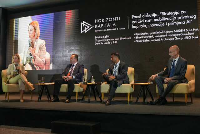 U panel diskusiji „Strategija za održivi rast: mobilizacija privatnog kapitala, inovacije i primjena AI“ učestvovali su Ilija Studen, predsjednik Uprave STUDEN&Co Holding, Bhavit Sawjani, Investment manager/Consultant i Omar Selim, Osnivač Arabesque Group i ESG Book.