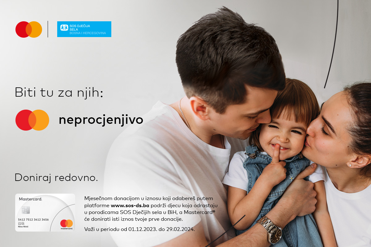 Kompanija Mastercard u BiH treću godinu zaredom podržava SOS Dječija sela u BiH kroz online donacije putem platforme https://sos-ds.ba/doniraj-facebook/. Tokom kampanje „Biti tu za njih“, svaki Mastercard korisnik, online mjesečnim doniranjem željenog iznosa, može dati lični doprinos pobošljanju života djece i mladih bez roditeljskog staranja.