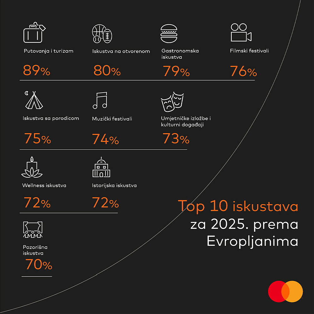 Dok se Evropa sprema za još jednu godinu spektakularnih događaja u svijetu sporta, muzike i filma, rezultati najnovije godišnje ankete kompanije Mastercard, Experience Economy, otkrivaju nove trendove u potrošačkim navikama. Dvije trećine ispitanika želi da uloži u ispunjenje svojih želja sa zacrtane „bucket liste“, birajući nezaboravne trenutke koji će im obezbijediti trajne uspomene, posebno u oblasti putovanja i turizma.