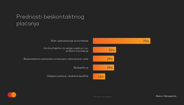 Kao glavnu prednost beskontaktnih plaćanja, MasterIndex ispitanici ističu da su ona brža i jednostavnija od drugih platnih metoda (70%), a ukazali su i na više aspekata njihove sigurnosti – počevši od toga da kartica / telefon sve vrijeme ostaje u ruci korisnika (32%), preko sigurnosnih tehnologija koje su primijenjene (29%) do činjenice da beskontaktna plaćanja smanjuju zdravstvene rizike (29%).