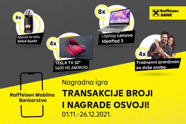 Do 26.12.2021. godine je u toku nagradna igra za korisnike Raiffeisen Mobilnog Bankarstva koji naprave minimalno jednu transakciju u periodu trajanja nagradne igre, te za nove klijente koji se registruju i aktiviraju aplikaciju. U okviru osam sedmičnih izvlačenja i dva mjesečna izvlačenja klijenti imaju priliku osvojiti vrijedne nagrade: laptop Lenovo IdeaPad 3, aparat za kafu Dolce Gusto, Tesla TV 32”S605 HD Android ili vaučer za turistički aranžman.