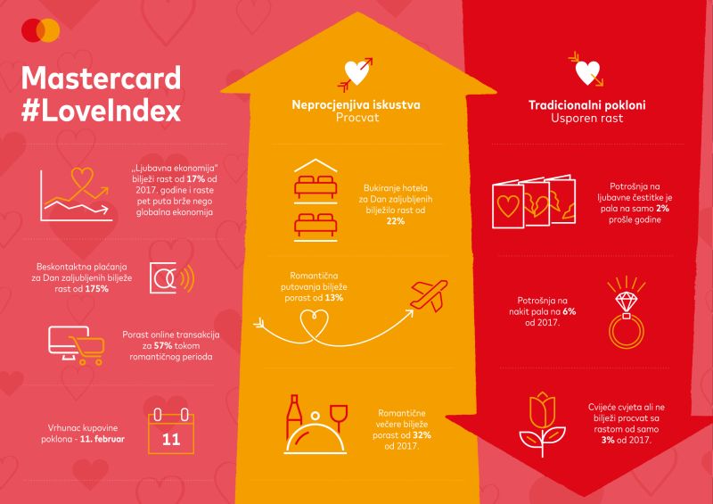 Mastercard LoveIndex je godišnja studija o navikama i trendovim trošenja uoči Dana zaljubljenih koja analizira transakcije kreditnim, debitnim i prepaid karticama širom svijeta. Nova studija koja je obuhvatila kartične transakcije iz više od 53 zemalje širom svijeta, pokazala je da ,,ljubavna ekonomija“ raste pet puta brže nego globalna ekonomija, sa potrošnjom od 17% za Dan zaljubljenih počev od 2017. godine.