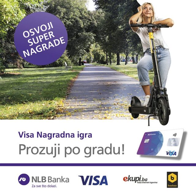 NLB Banka d.d. Sarajevo, u saradnji sa Visa kartičnom kućom, za svoje klijente pripremila je novu nagradnu igru pod sloganom „Prozuji po gradu“. Tako svi klijenti koji izvrše najmanje tri transakcije sa Visa Classic, Visa Gold i Visa Electron karticama NLB Banke, u periodu od 15.09. do 31.10. 2020. godine, na bilo kojem prodajnom mjestu, imaju mogućnost da učestvuju u VISA nagradnoj igri „Visa karticu provuci i skuter odvuci“.