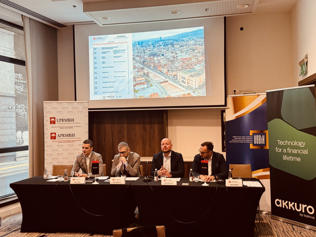 Udruženje profesionalnih rizik menadžera u Bosni i Hercegovini (UPRMBiH) je u petak – 17 aprila u Sarajevu, u saradnji sa Udruženjem banaka Bosne i Hercegovine, Akkuro i Holland Fintech Association uspješno organizovalo okrugli stol pod nazivom „Otpornost bankarskog sektora u eri vještačke inteligencije“ s ciljem približavanja savremenih metodoloških pristupa i regulatornih zahtjeva u kontekstu primjene vještačke inteligencije u bankarskom sektoru, kao i sagledavanja njihovog uticaja na poslovanje, upravljanje rizicima i dugoročnu stabilnost finansijskih institucija.