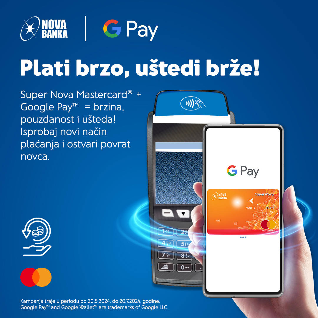 Nova banka i Mastercard® najavili su pokretanje nove promotivne kampanje koja korisnicima Super Nova Mastercard® kartica omogućava da ostvare povrat novca ukoliko transakcije izvrše putem Google Pay™ digitalnog novčanika. Kampanja će trajati od 20. maja do 20. jula i za prvih 1.000 korisnika omogućava da za tri transakcije plaćanja roba i usluga od 2 KM ili više putem Google Pay™ ostvare povrat novca u iznosu od 20,00 KM.