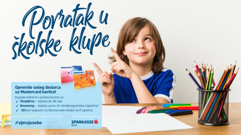 U aktuelnim pripremama za novu školsku godinu, Sparkasse Bank preporučuje Mastercard kreditne kartice Shop&Fun i Revolving sa kojima nabavku školske opreme možete prilagoditi Vašem mjesečnom budžetu, do 36 rata ili uz odgodu plaćanja, te dodatnu pogodnost od 15% popusta za kupovinu računara i prateće opreme na DOMOD web shopu.