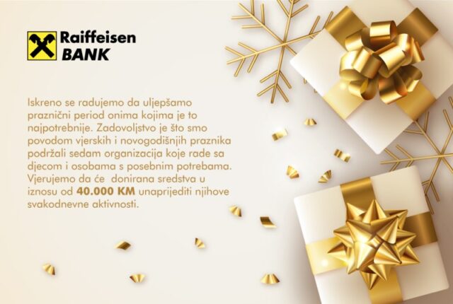 Raiffeisen banka je povodom predstojećih vjerskih praznika i Nove godine donirala ukupno 40.000 KM i to: ukupno 10.000 KM organizacijama „JUP Beli anđeo“, Bosanski Brod, „Koraci nade“, Tuzla, „Specijalna olimpijada BiH za osobe sa invaliditetom“ iz Sarajeva, te „Dom za socijalno i zdravstveno zbrinjavanje osoba sa invaliditetom i drugih osoba“ iz Stoca, kao i po 10.000 KM „SOS Dječijem selu“ Sarajevo, Udruženju „Srce za djecu koja boluju od raka“, te „Udruženju za pomoć mentalno nedovoljno razvijenim licima, Banjaluka“.
