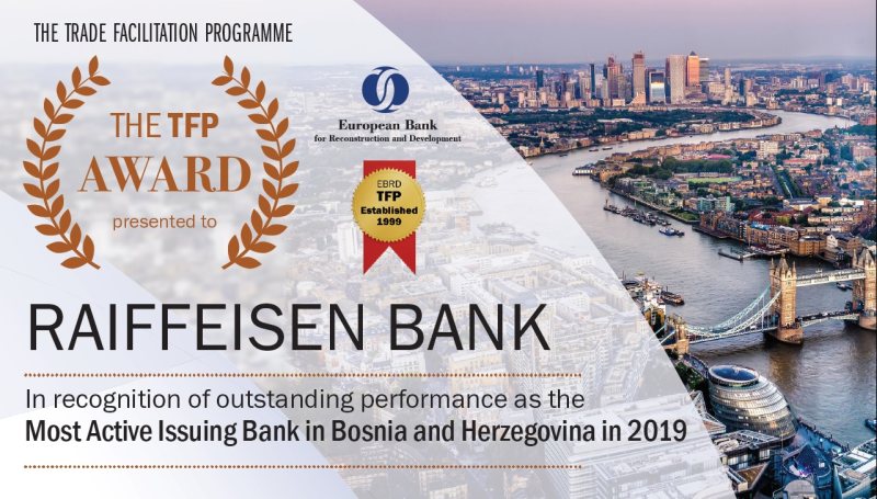 U okviru Trade Facilitation Programme-a (TFP) priznanje za Najaktivniju banku izdavaoca finansijskih instrumenata u 2019. godini je Raiffeisen banci u Bosni i Hercegovini dodijelila Evropska banka za obnovu i razvoj (EBRD). Raiffeisen banka je višestruki dobitnik ovog priznanja.