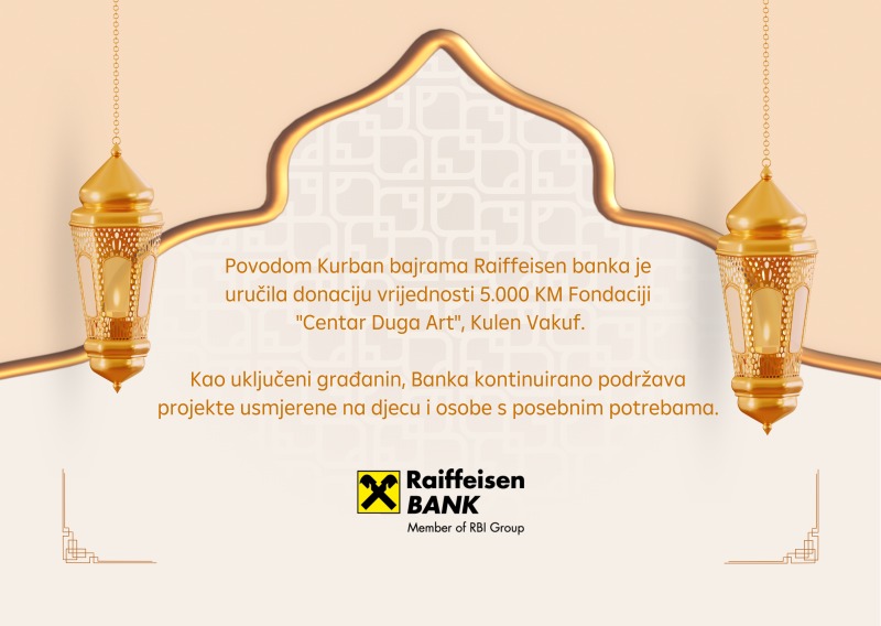 Povodom Kurban bajrama Raiffeisen banka je uručila donaciju vrijednosti 5.000 KM Fondaciji „Centar Duga Art“, Kulen Vakuf. Cilj ove Fondacije je zbrinjavanje djece starosti do šest godina koja su privremeno ili trajno ostala bez roditeljske zaštite.