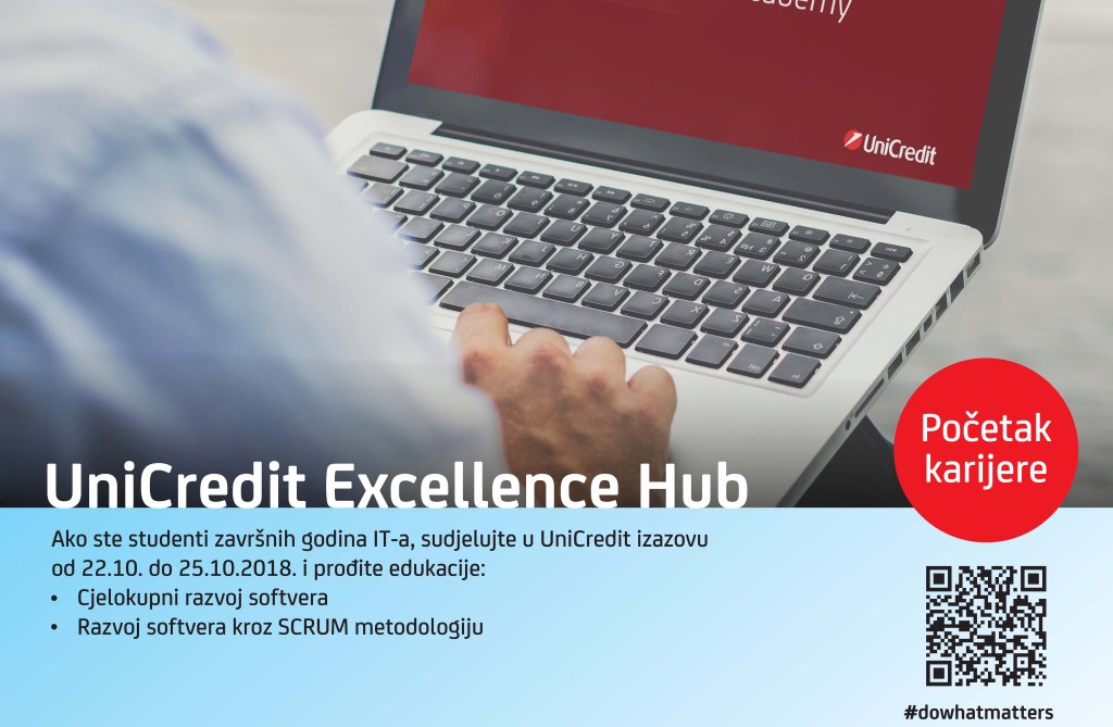 UniCredit Bank poziva studente završnih godina IT usmjerenja da se prijave i sudjeluju u UniCredit Excellence Hub-u u sklopu kojeg će imati priliku proći trodnevnu edukaciju na temu cjelokupnog razvoja softvera kroz SCRUM metodologiju, te učestvovati na mini hackathonu.