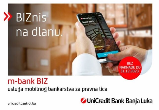 Za m-bank BIZ uslugu moguće je aplicirati u najbližoj filijali UniCredit banke Banja Luka te istu koristiti bez mjesečne naknade, samo do 31.12.2023. godine!