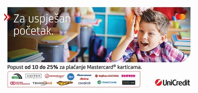 Prilikom plaćanja UniCredit Mastercard karticama na prodajnim mjestima UniCredit partnera, uključujući i internet prodavnice, UniCredit u BiH obezbijedila je popuste za kupovinu novog školskog pribora, odjeće, obuće i elektronske opreme.
