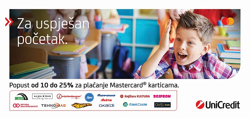 Kako bi prvo školsko zvono i nove obaveze školarci i njihovi roditelji dočekali spremni, UniCredit u BiH je, zajedno s partnerima, pripremila popuste od 10% do 25% za sve klijente UniCredit Mastercard kartica, koji do 30.09.2022. godine obave kupovinu kod odabranih trgovaca.