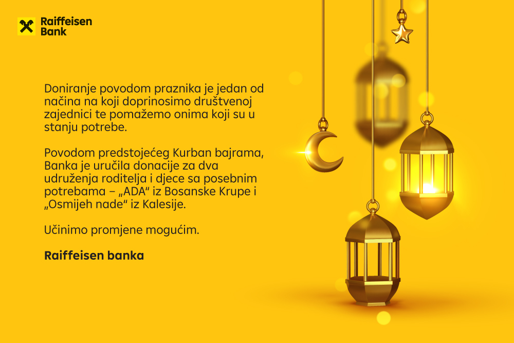 Povodom Kurban bajrama Raiffeisen banka je uručila donacije dvjema organizacijama. Podržano je udruženje „Osmijeh nade“ iz Kalesije koje okuplja djecu i omladinu sa posebnim potrebama, te radi na poboljšanju njihovog statusa, socijalne zaštite i uključenosti u društvenu zajednicu. Donacija je uručena i udruženju „ADA“, Bosanska Krupa čije su aktivnosti usmjerene na pružanje pomoći djeci i mladim s posebnim potrebama koja su nastanjena na području grada Bosanska Krupa i nisu obuhvaćena nikakvim vidom odgojno-obrazovnog sistema.