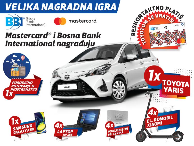Bosna Bank International (BBI) d.d. u saradnji sa kompanijom Mastercard® pokrenula je nagradnu igru za sve korisnike Mastercard® kartica izdatih od BBI banke sa glavnim nagradama: putnički automobil „Toyota Yaris“, turističko porodično putovanje u inostranstvo i mobitel „Samsung Galaxy“ A80.