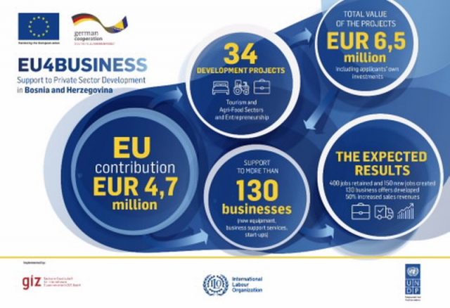 U okviru EU4Business ukupno je dostupno 10 miliona eura bespovratnih sredstava EU koji će se koristiti kao poticaj BiH ekonomiji i pomoć firmama, poljoprivrednicima i poduzetnicima u očuvanju radnih mjesta. Osim toga, projekat pomaže mladim i ženama poduzetnicima da pokrenu vlastitu djelatnost, a vrši i nova ulaganja u sektoru turizma, poljoprivrede i ruralnih područja, čime će se zajednicama u BiH omogućiti brži oporavak.